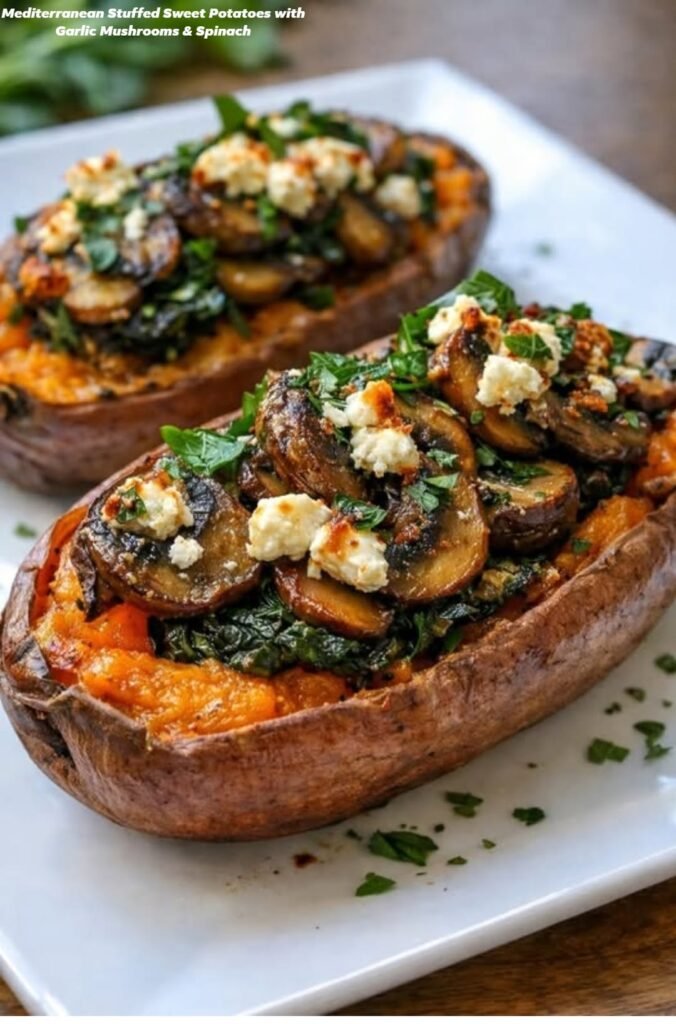 Mediterranean Stuffed Sweet Potatoes with Garlic Mushrooms & Spinach